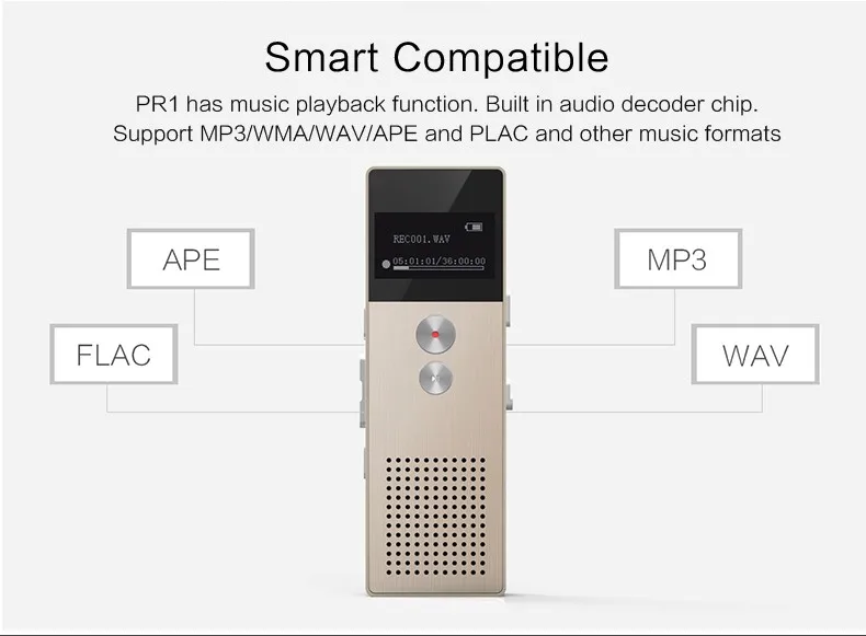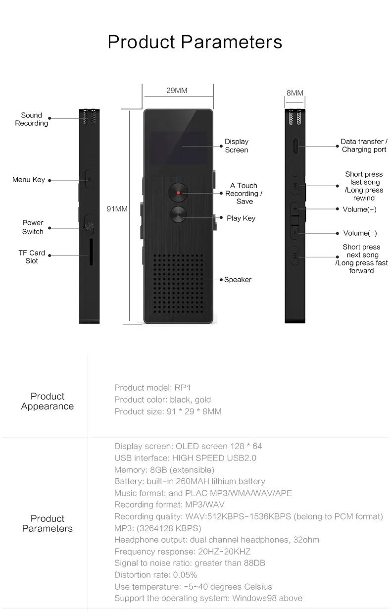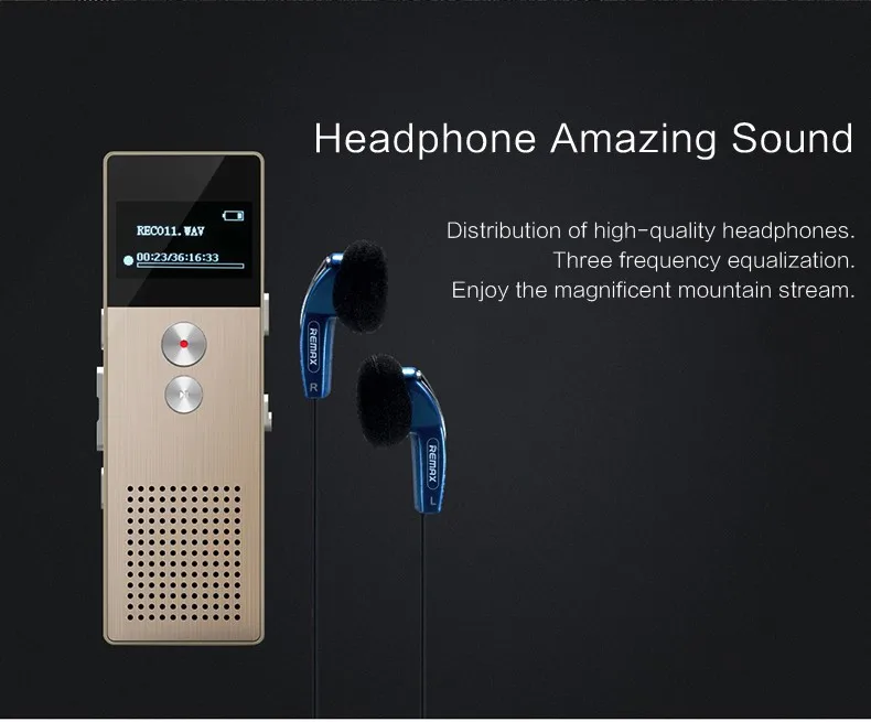 Remax USA Support MP3 music playback and MAV sound recording Can record for a long time and also have telephone recording function With Line-in audio direct recording function Can record the recording date With A-B repeating function With built-in Mic With external high power speaker Built-in Lithium battery, can record continuously for 13 hours